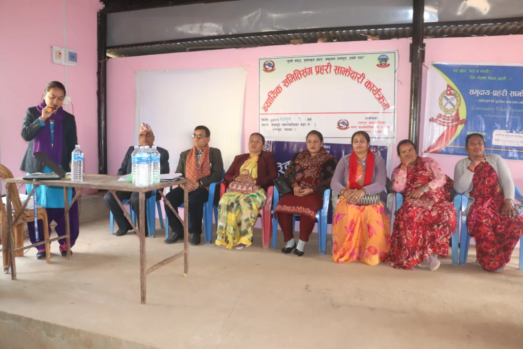पाल्पा ,न्यायीक समिति संग प्रहरी साझेदारी कार्यक्रम रामपुर पाल्पामा सम्पन्न भएको छ । रामपुर नगरपालिका न्यायीक समितिको आयोजनामा वडा नं.३ रजघरामा शुक्रबार कार्यक्रम सम्पन्न भएको